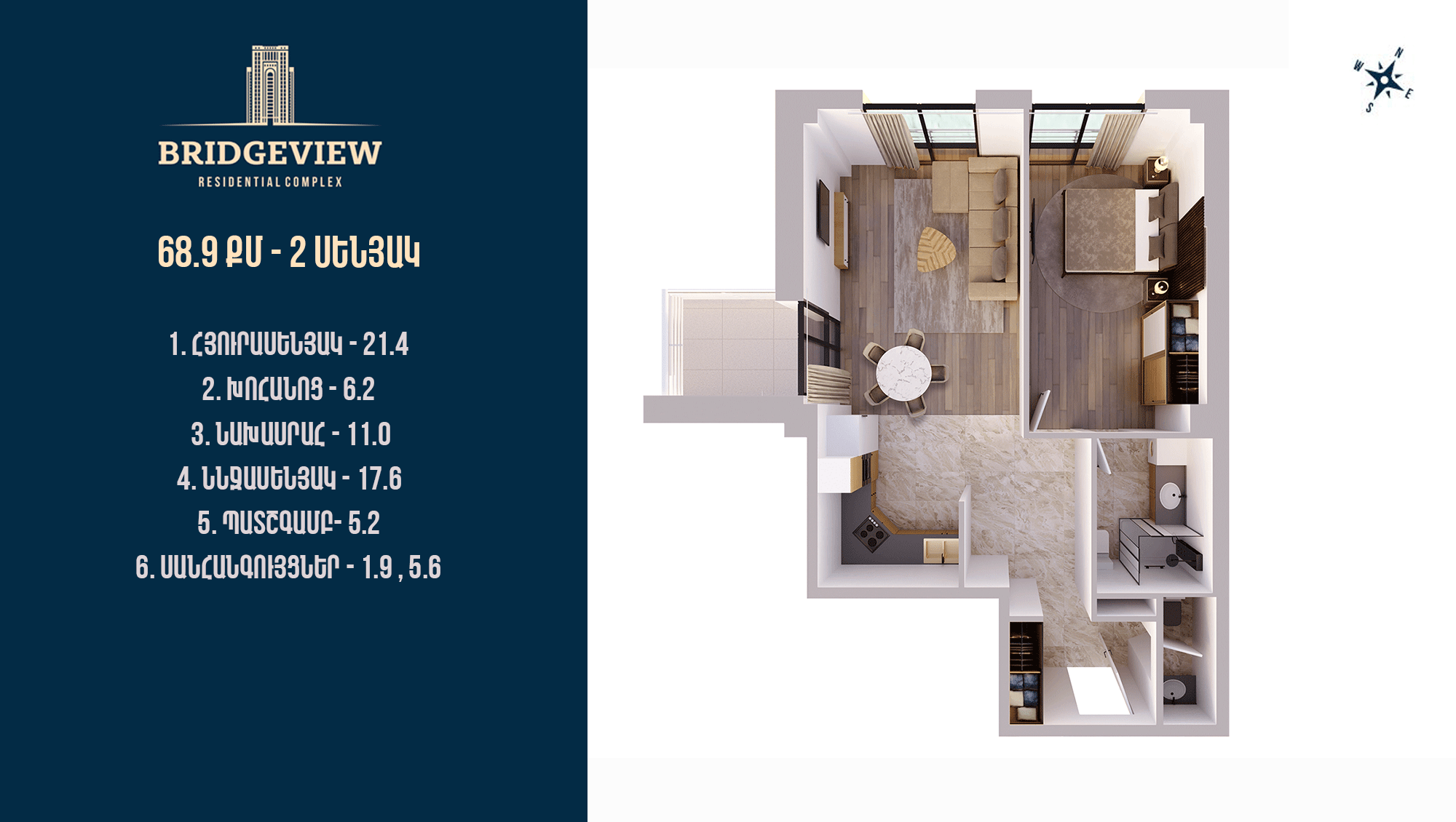 1 մուտք | 10 հարկ | 69 քմ | 2 սենյակ