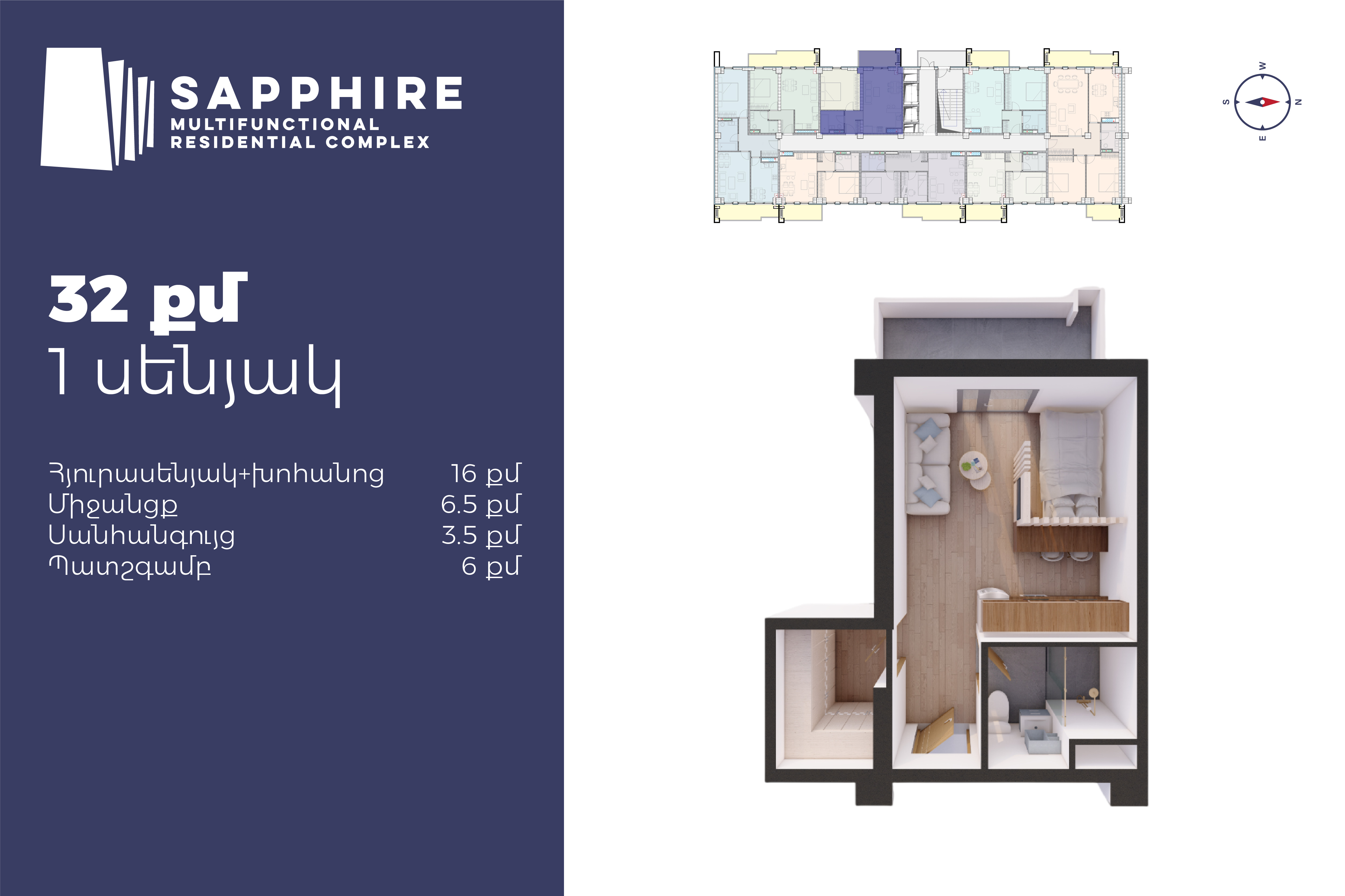 2 մ-շ | 1 մուտք | 3 հարկ | 32 քմ | 1 սենյակ
