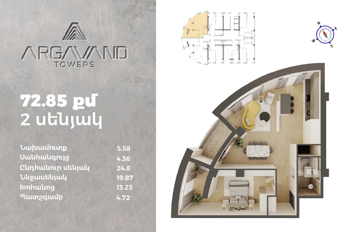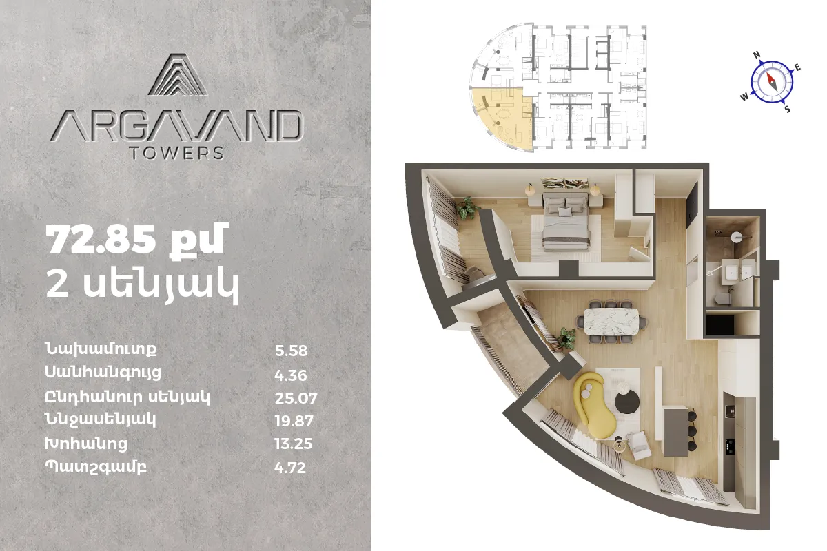 1 մ-շ | 3 հարկ | 73 քմ | 2 սենյակ