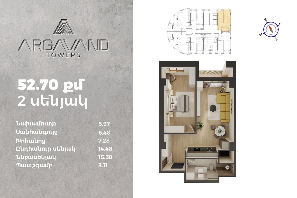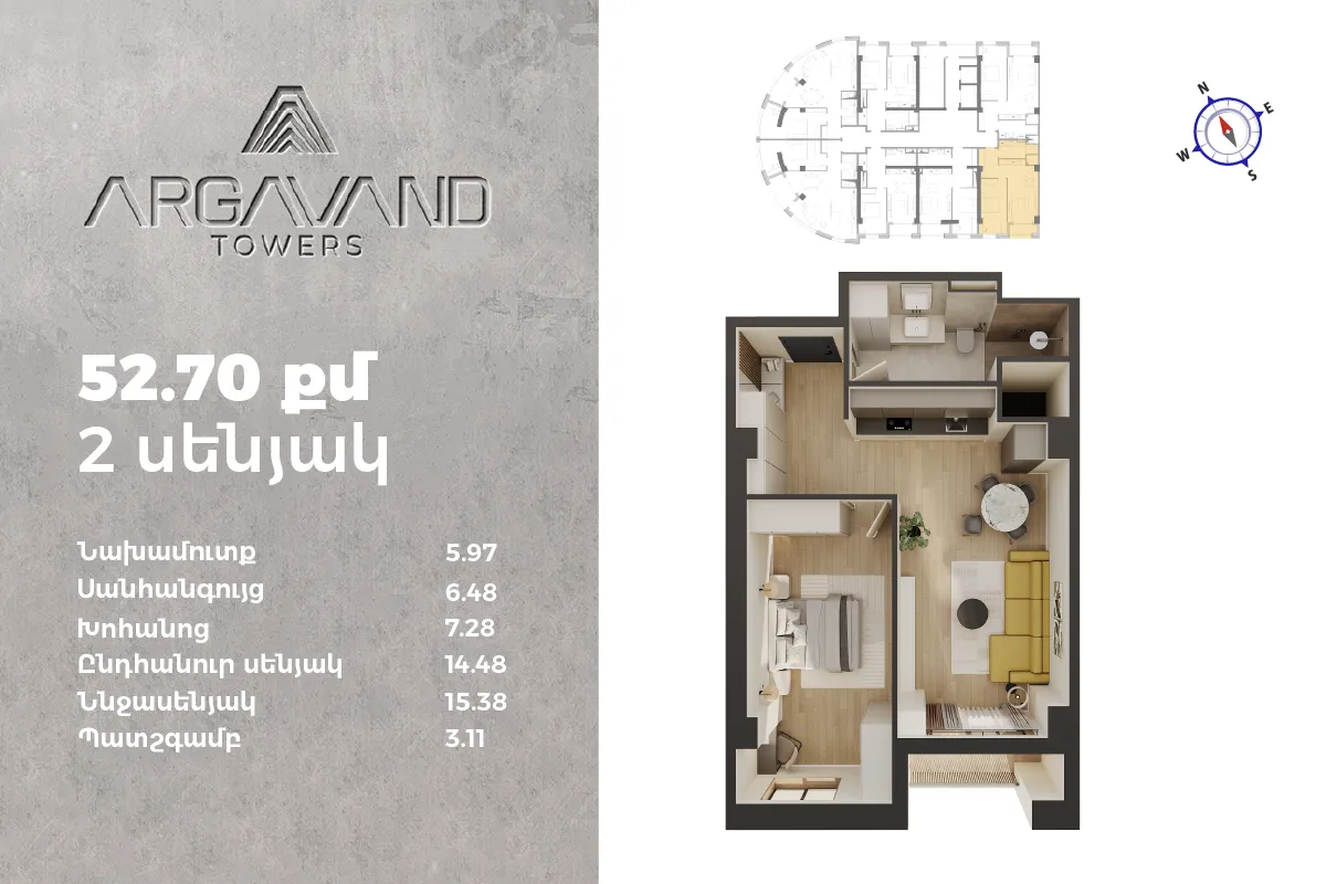 1 մ-շ | 3 հարկ | 53 քմ | 2 սենյակ