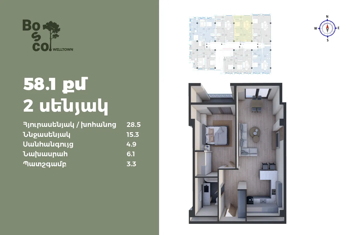 1 մ-շ | 1 մուտք | 1 հարկ | 58 քմ | 2 սենյակ