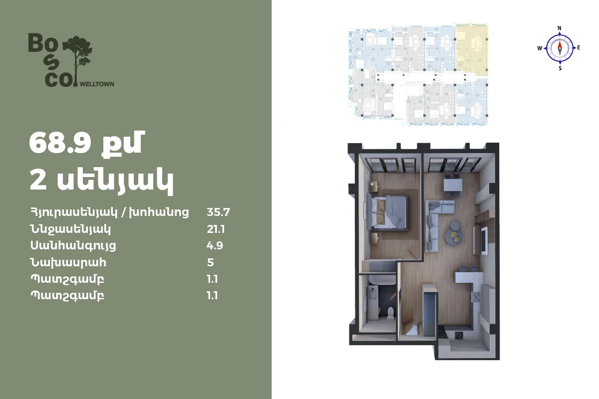 1 մ-շ | 1 մուտք | 2 հարկ | 69 քմ | 2 սենյակ
