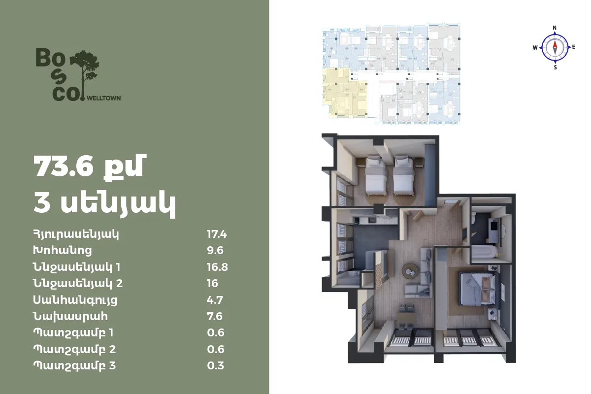 1 մ-շ | 1 մուտք | 1 հարկ | 74 քմ | 3 սենյակ