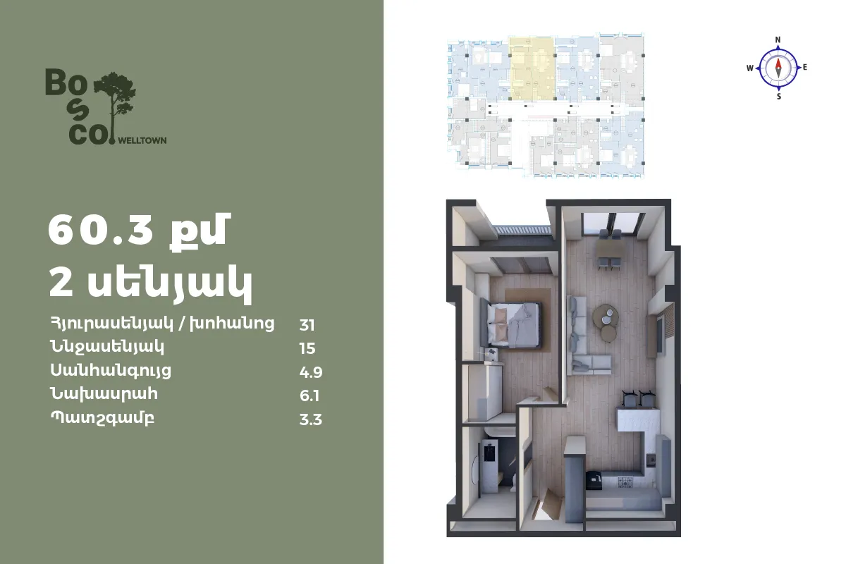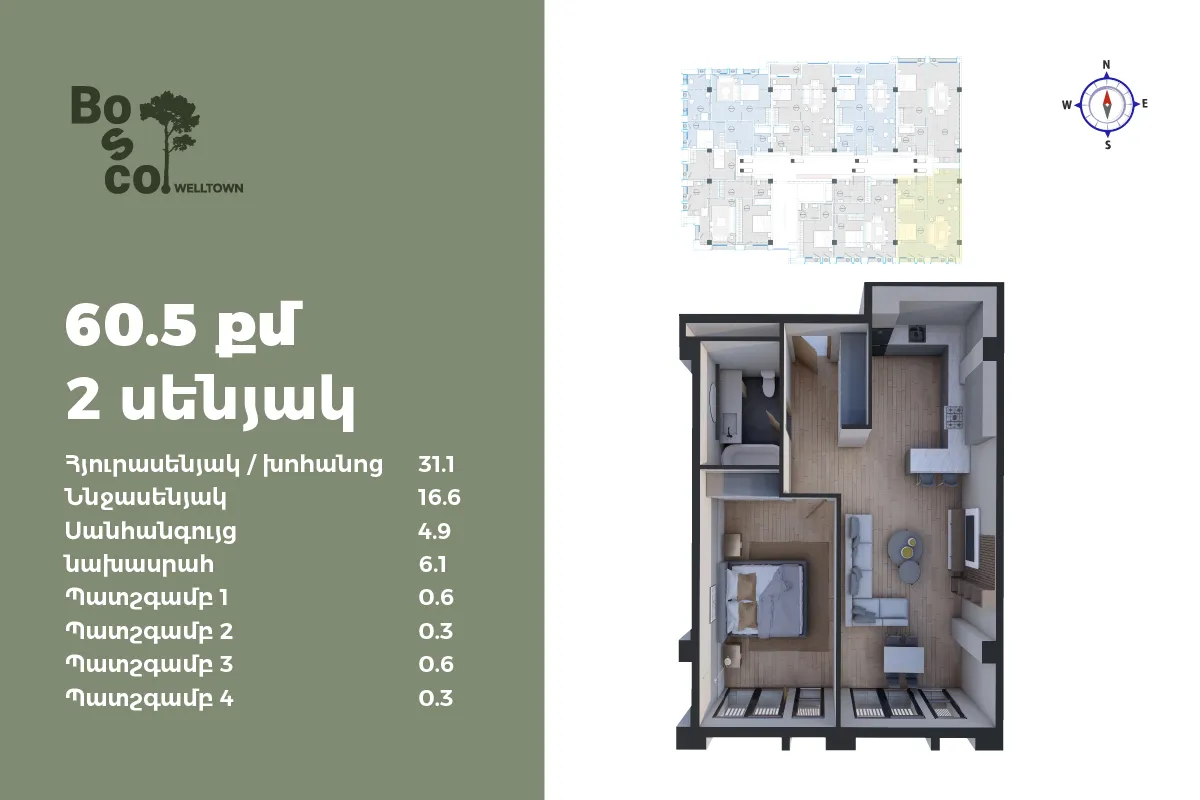 1 մ-շ | 1 մուտք | 1 հարկ | 60 քմ | 2 սենյակ