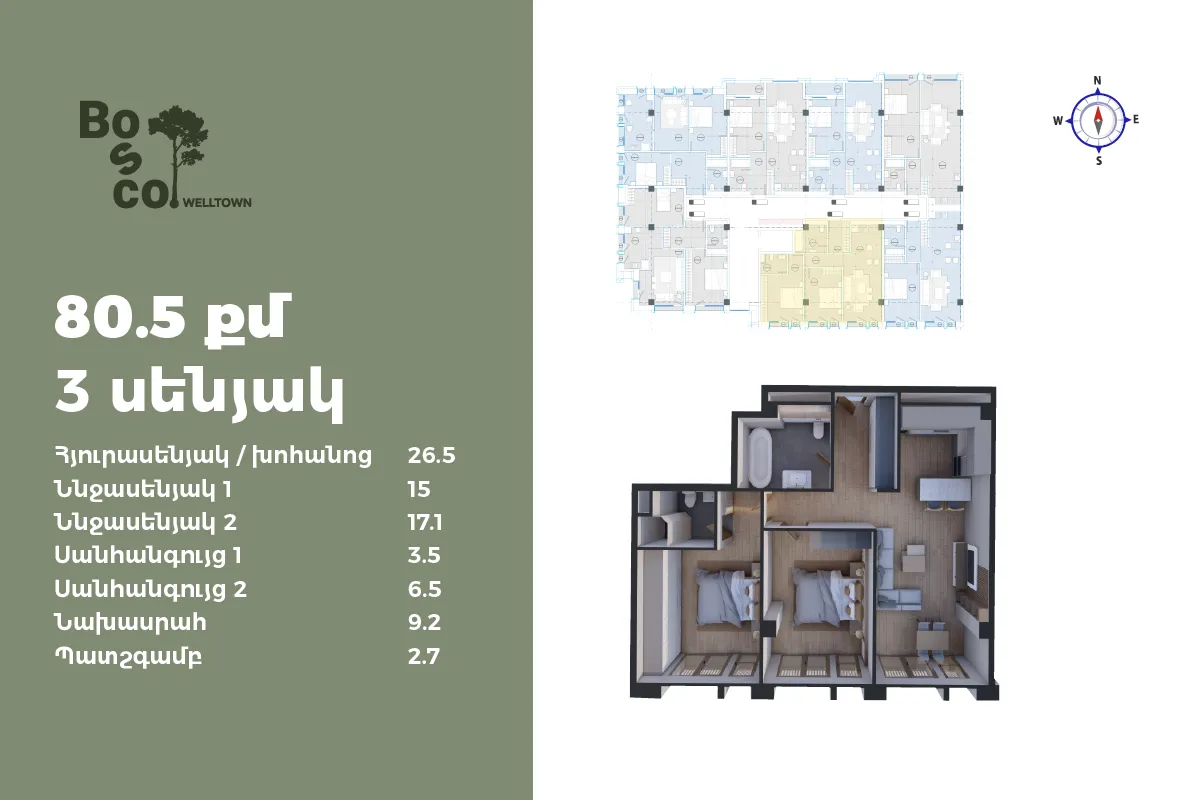 1 մ-շ | 1 մուտք | 1 հարկ | 81 քմ | 3 սենյակ